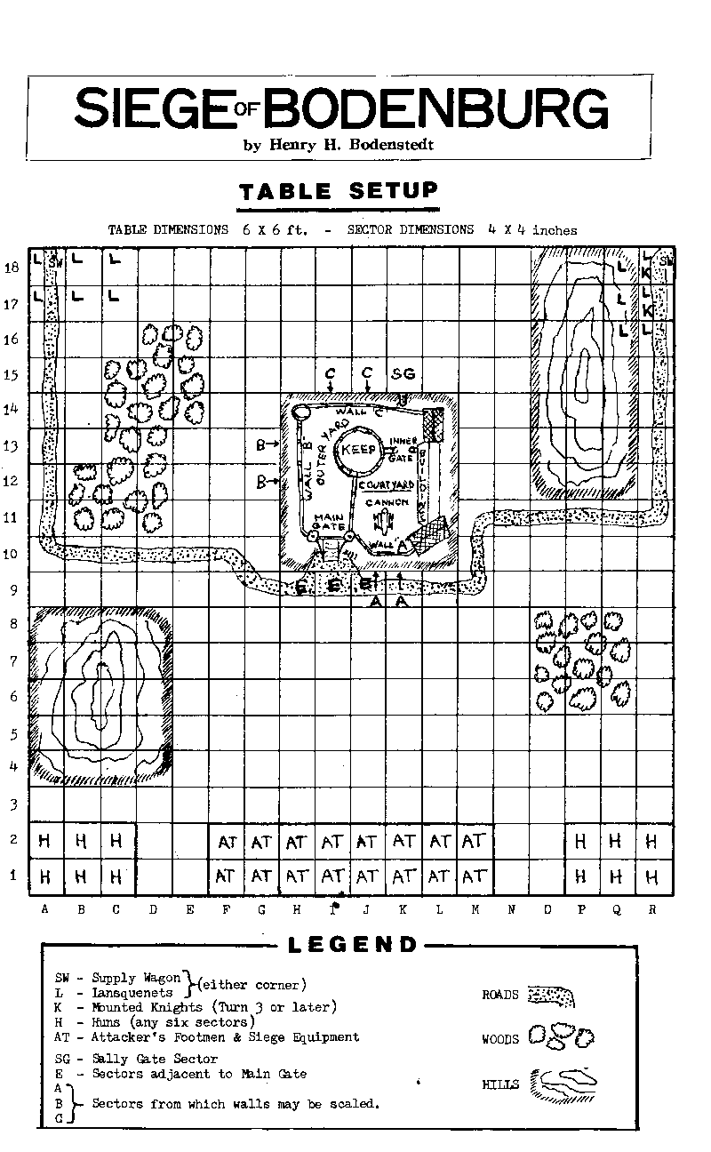 Henry used to sell his wares at various shows, conventions and meets. Invariably, he would pack along the Siege of Bodenburg. The game was part of the schedule of wargaming meets. It required the use of specific Elastolin products. and invariably helped promote one of Henry's prime products. The game was fun, easy to learn and good for a nice afternoon's sport. Henry had printed up tens of thousands of copies of the game rules, and gave them out liberally to all and sundry.