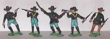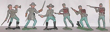 The British firm of Crescent produced notable military figures of the period, including both American Civil War and Western-style U.S. Cavalry figures. These are a hair taller than 60mm. The Civil War set includes six Infantrymen. As with many other U.S. and british makers, producing opposite sides for the Ciovil War was a matter of changing the color of the plastic. The same molds produced Union Yankees and Confederate Goobers.