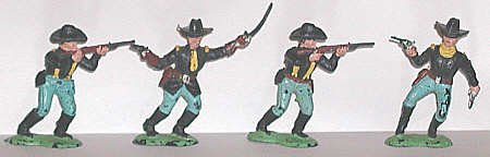 Cavalry figures were intended for play with Wild Indians. The poses and equipment - including the scout - look as if they are right out of a movie.