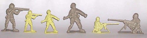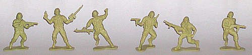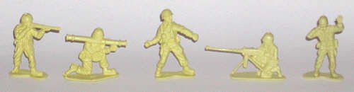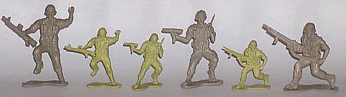 The initial run of soldiers for Desert Storm were amusing, if not outright hilarious. Because the new new U.S. Army helmet, toymakers issued World War II German troops in green and tan, labelled as U.S. troops. The first plastic figures designed for Desert Storm appeared later. There were six poses of U.S. soldiers armed with modern weaponry. These included two men with M-60 light machine guns, one with the M203 "over and under" grenade launcher, one with a Mac -10 submachine gun, one with a "grease gun" type submachine gun, and one with an M-16 and a pistol. The poses weren't classic, but in a field where new figures are rare, they were welcomed.