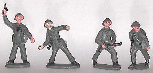 I was pleasantly surprised to acquire this East German foursome. They were made in East Germany during the Cold War. The soldiers have the typical flat East German helmet and Soviet-bloc weapons. in this case, they carry folding-stock versions of the AK series of assault rifle. The field gear and officer's holster look very might like those of World War II era soldiers, and the overall size and sculpting are similar to larger composition figures. The grenadier throws an egg-style hand grenade, rather than the stick type common to Communist and older German armies. Initially, the troops seemed to be the "standard" size for German composition figures, but these fellow were a bit bigger than our in-house Elastolin figures.