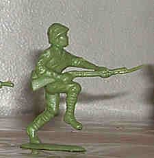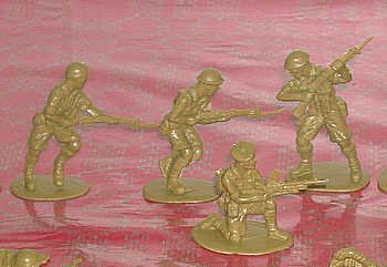 Hing Fat clones both Airfix and Matchbox riflemen. Here you can compare them. The two kneeling riflemen to the left are Matchbox clones, the kneeling and standing rifleman to the right are cloned Airfix. |