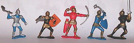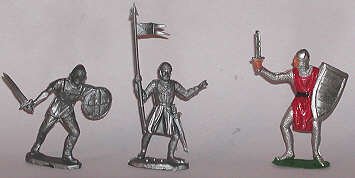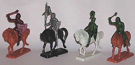 The knights shown below are from various makers. Most are British or European, with one Chinese product line represented. All show various approaches to capturing the Medieval warrior in miniature. All were sold as toy soldiers.