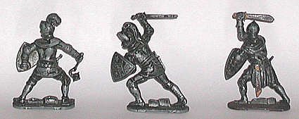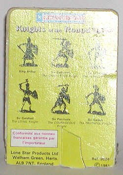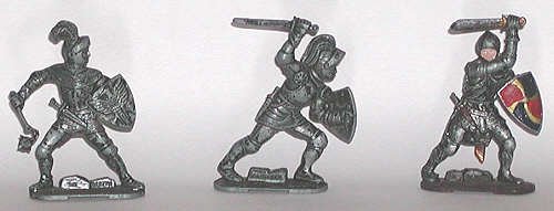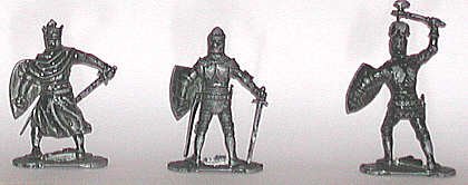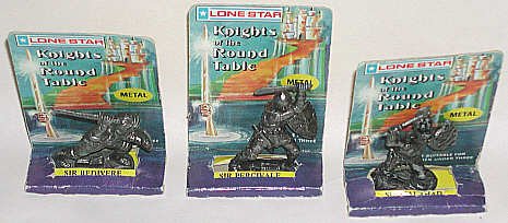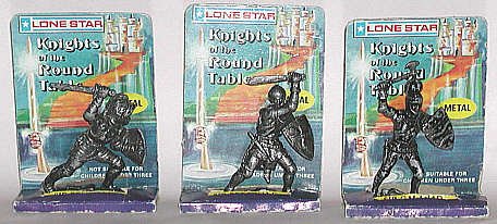 The British firm Lone Star had made several series of diecast figures called "Metallions." One series was a set of six Knights of the Round Table. Pictured above, from left ,are King Arthur, Sir Lancelot and Sir Gallahad. Spelling of names are those on the figures. (The series also included Western figures). |
