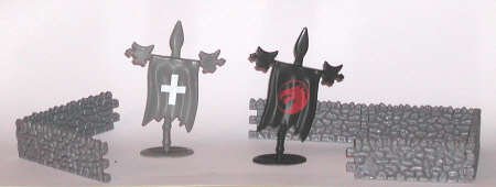 This set had six wall section and two banners. Walls look like clones of Britains' plastic stone fence. |
