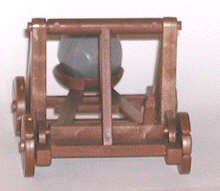 Loaded to go. Tab above the left wheel is launcher. Just press it and it levers the firing arm, slinging the "rock." Simpler and much more effective than the old Marx "rubber band" catapults.. |