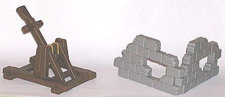 Unknown brand firing toy catapult and knock-down plastic walls. |