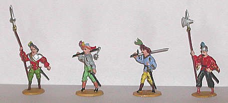 Here we have a man with a partizan, soldier with morningstar mace, soldier with two-handed broadsword and a halbardier. In real life, the latter three would be used to protect the flanks of a unit of Pikemen. |