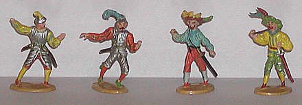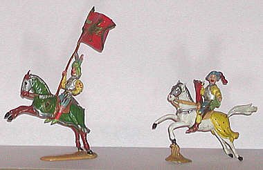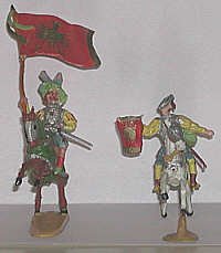 The figures shown here were made by the Walter Merten company of Berlin, Germany. Merten was a competitor to Elastolin. Both produced 40mm scale Medieval figures, but Merten's range was limited to armored knights and landsknechts. Merten did not produce the other colorful medieval types, though the company made Bedouin Arabs, American Civil War figures, cowboys & Indians and modern US and German troops. Though the Merten medieval ranges were fewer, the number of different poses was greater than Elastolin's.
