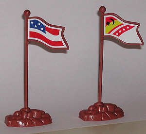 You have to wonder what the Chinese toymakers will invent next. Obviously this set was intended to mimic current conflicts, but those flags! The parody U.S. flag is funny enough, and the other is downright bizarre. While the moon and crescent could imply an Arab country, the rest of the design is pure fantasy. |
