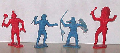 Mohawk with tomahawk and scalp, Indian with knife, spearman with shield, Chief with war club. |