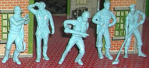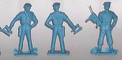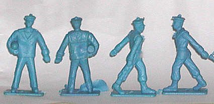Ideal's sailors are about 70mm tall and have a thin, spare build. From left: shore patrol, deep sea diver, semaphore man, officer, sailor with rope. |