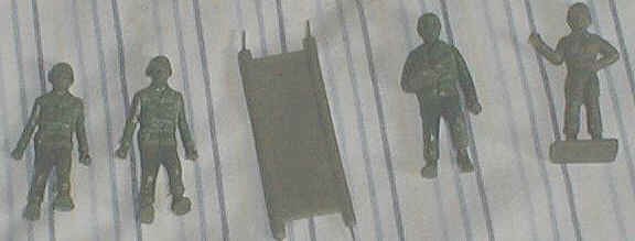 The medical team includes stretcher bearers, a wounded man, dog and Army nurse. Some versions of the Nurse are holding an IV bottle, which is sometimes mistaken for a lantern.