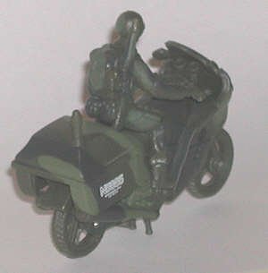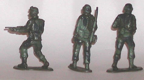 These three came with the tent, bike and AAA gun. The man on the left has an unusual weapon: light machine gun or combat shotgun? Center is walking rifleman, and right is ammo loader for the AAA gun. |