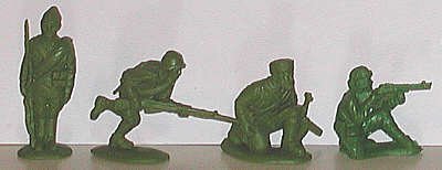 Prone machine-gunner (we have not assembled wheels), sailor throwing grenade, paratrooper landing and officer with pistol. Paratrooper's resembles a 1/76 Spanish-made figure from the 60s.. |