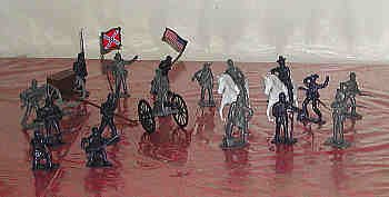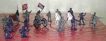 BMC Civil War figures, caisson and cannon. The mounted officers and figures standing in front of the horses are character figures representing famous generals. Note that the Confederate standard bearer is a different pose from the Union flag bearer. Aside from character figures and standard bearers, troops for opposing sides are a matter of using different colors in the same molds. |