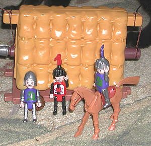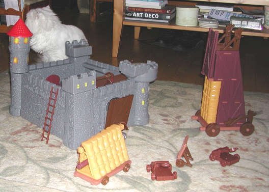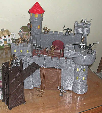 Ram is a good size for these knights. This castle may be a pure toy, but its design is such it would be useful for playing Castle Cracker. There is adequate room inside for defenders. |