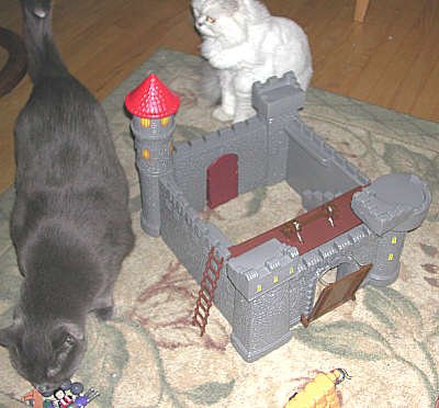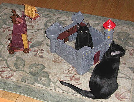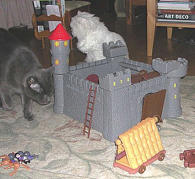 Peake the Kitten finds this castle a nice hide-out. Shadow stands by, waiting her turn to get inside. |