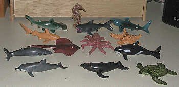 Turtle, seal and shark from Target set. All animals, crustaceans and fish are a rubberlike material, such as vinyl or PVC. They are painted. |