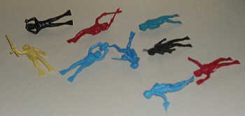 Scuba-dubas from the Fishler sets. Man in upper left is using a camera. Some look like regular divers, but the ones with spearguns and the blue on toward the lower right with pistol and knife are like characters from a James Bond movie. |
