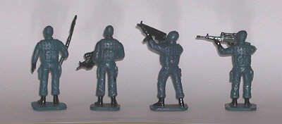 These are sold as "SWAT" policemen. Note the ski masks. From left, the weapons are riot shotgun, assault gun, MP5 submachine gun, sniper rifle. These figures look more like SAS commandos than policemen. |