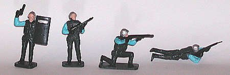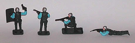 Toy SWAT policemen are invariably armed and outfitted like commandos. The examples shown here would be equally at home in a combat raid as in emergency law enforcement.