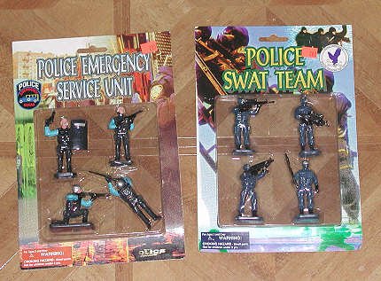 These are sold as "Emergency" police, perhaps implying a riot squad. They are painted to look more like regular officers, though they look more like.conventional SWAT types. From left: riot shield and automatic pistol, shotgun, riot shotgun, automatic rifle. |