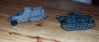 Tanks: the epitome of vehicles for plastic soldiers, the tank is the star of the battlefield. Since it first appeared in World War I, it has been the wunderkind of toy warfare. In the real world, the tank had an uncertain development. The first tanks were little more than lightly armored machine-gun and light artillery vehicles. The Mk 1 series, a rhomboidal contraption with guns mounted in side sponsons, struck fear into German forces. Its slow and ponderous movement made it an easy target for artillery, but it changed warfare forever. France's small Renault Char'D was a lighter, faster vehicle which remained in the inventory of some countries into World War II. US, British and Russian tank development were a catch-as-catch - can things throughout the 1920s and 1930s. Only France and Germany had respectable armor-development programs. The war saw several countries armor-programs caught short. This led to early disasters for the British in 1940 in Europe and Africa. France was caught short, not for the quality of its tanks, but the lack of a good armored warfare doctrine. Russia, whose tank development was awkward, found themselves far outclassed by the German armor and tactics.