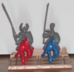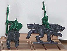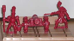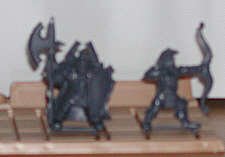 This little set is intriguing, because the figures are made to be placed on large trays. Each miniature has a little bar under its feet. The bar fits slots in the trays. This is identical to miniature wargaming. The figures are approximately 25mm / 30mm scale. The folks on our Email Group identified these as playing pieces from a Milton Bradley game called "Battlemasters." It is a basic fantasy wargame that was publishing in the mid-1990s., These are pretty good figures for game playing pieces, and would do well if painted by a hobbyist.
