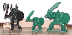 Black monster, little green monster man, big green monster man. In conventional fantasy games, the little one might be a goblin, the larger ones orcs or trolls. |