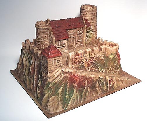 Elastolin produced an assortment of vacuformed plastic castles, scales for use with figures from 25mm to 40mm. They were a great accessory for their figures. We are fortunate to have photos of some of these. They were quite striking. The Bodenburg" castle is of special note, as it was the centerpiece of the "Siege of Bodenburg" game written by the late Henry Bodenstedt. In a way, Henry planned the game specifically for that castle. We also have a photo of another, smaller castle from Elastolin. Elastolin castle s were based on German castles.