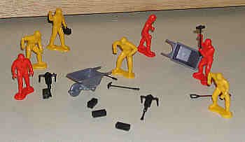 Among the non-combat toy figures are various kinds of workers. This dates back to the 1920s, when several toy soldier companies cast lead figures of railroad personnel. Working figures are very popular today, as they are often included with construction truck sets.