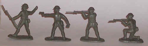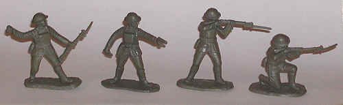 The US Marines and US Army are the same figures, just different shades of brownish green. These four advancing figures include riflemen plus a BAR gunner.and trooper armed with a shotgun. The plastic is a PVC rubber-like type, a bit too flexible. |