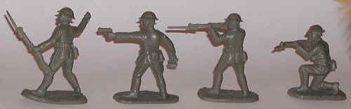 The most popular eras for plastic soldiers were "Modern" troops (World War II to 1970), Wild West figures, Spacemen. the American Civil War and Medieval knights. World War I troops may have been popular as lead figures, but they were uncommon in plastic. Of course, for figures made in the 1920s and 1930s, the World War I style uniform was quite "modern." The first plastic soldiers with the flat trench helmet were troops of the late 1930s, with a very different cut of uniform. Beton soon replaced those flat helmets with a standard M1 field helmet. .The only World war I figures made were part of a small playset. They were undersized flat types, molded in red, and there were three or four of them packed with a couple of biplanes and a rhomboid-shaped tank. Airfix introduced World war I troops in 20mm, but no larger troops appeared in significant enough numbers to be noticed.
