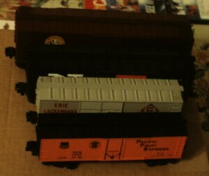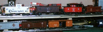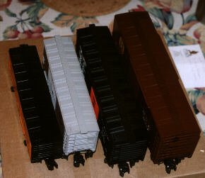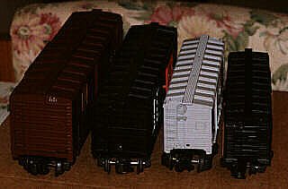 From L to R: Scale, Railking woodside (almost scale), Marx / K-Line Deluxe (classic) and Lionel (actually O27). Note by comparison the O27 boxcars underneath. |