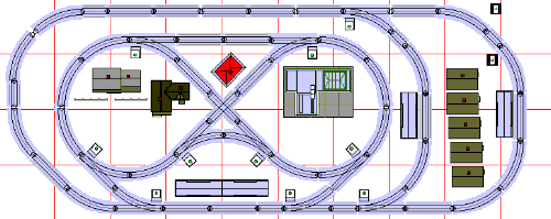 Many will undoubtedly prefer MTH's Realtrack system. Though it clips together in a unique way, it works much like other O Gauge track. Starting with an oval, you can gradually expand by adding switches and track. Since Realtrack costs more than regular tubular rail, it is good to have a gradual plan to expand, should the cost might prohibit building the complete layout at once. The last layout shows how to add a crossover to the layout - this requires no expansion. The addition on a loop to the left would require adding two feet to the layout, however. It is up to you whether to stop at 4' by 8', or eventually expand to 4' by 10'. All track is O-31.