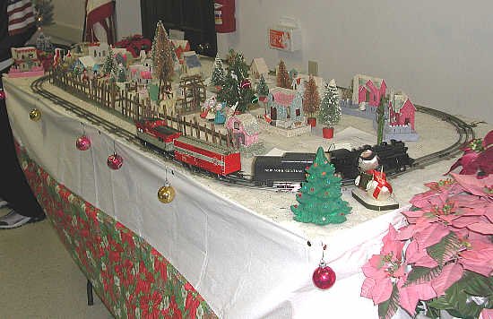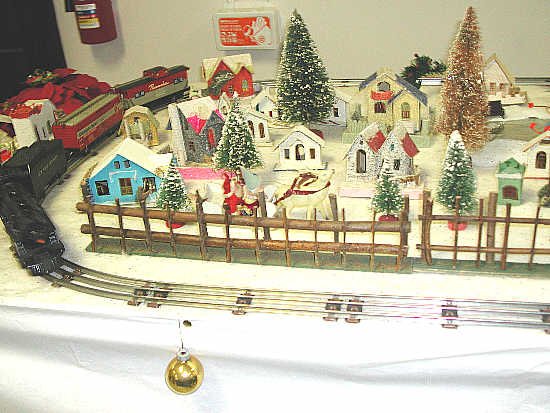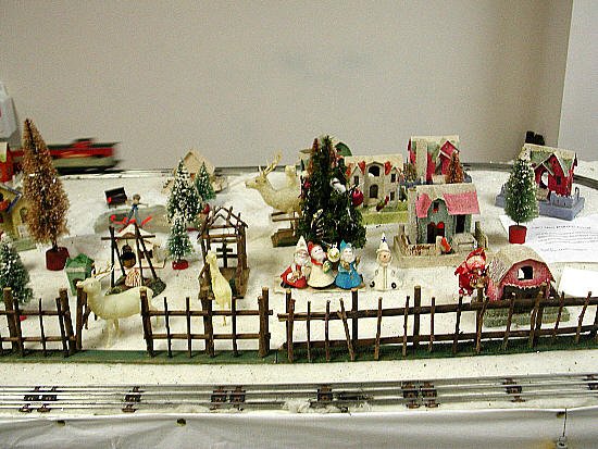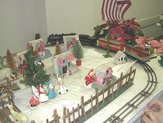 Gary's wife was fixing an ornament while I photographed the train. Note the wood fence and those paper figures, circa 1958 |