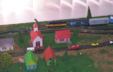 The challenge - build a simple N scale railroad without having the luxury of time to do a picture-perfect job. The goal was to make it sturdy, bright and attractive. I think we did okay, too. The railroad was finished in a couple of two-hour sessions. The methods we used for scenery are those given in our online scenery manuals.