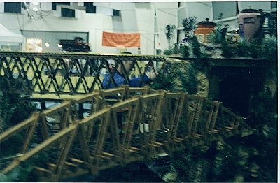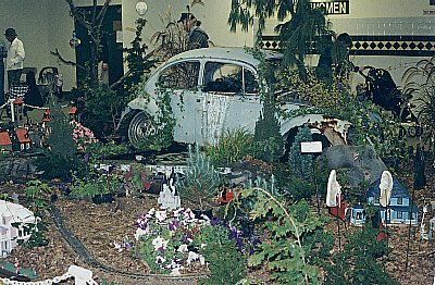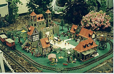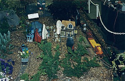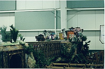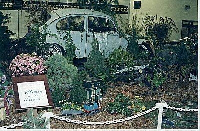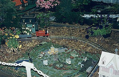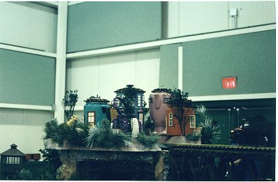 Here are photos of the colorful display from the East Coast show. Also shown is the teapot village featured on the layout of the Chesapeake & Allegheny Large Scale club. Note the "Volkwagen Waterfall" - the centerpiece of the display.