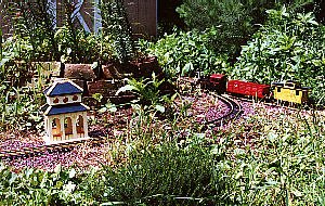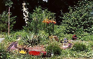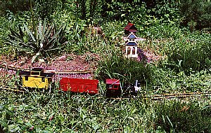 We moved into our new home at the end of June, 1999. The yard was a mess. In Autumn, we cleared out 22 full trash bags, 3 barrels, 4 crates of trash & dead leaves, plus 8 angle irons, about 40 foot of pipe and odd junk. The yard was now ready. One problem - every where we dug or scraped earth, we uncovered bricks. 170+ whole bricks. Well, they make great landscaping stone.....and they became a joke. "The Conover Street Brick Mine." Thus, when our garden railways was built, it was The Conover Street Brick Mine Railway. Yes, it is a work in progress.....these are the first photos.