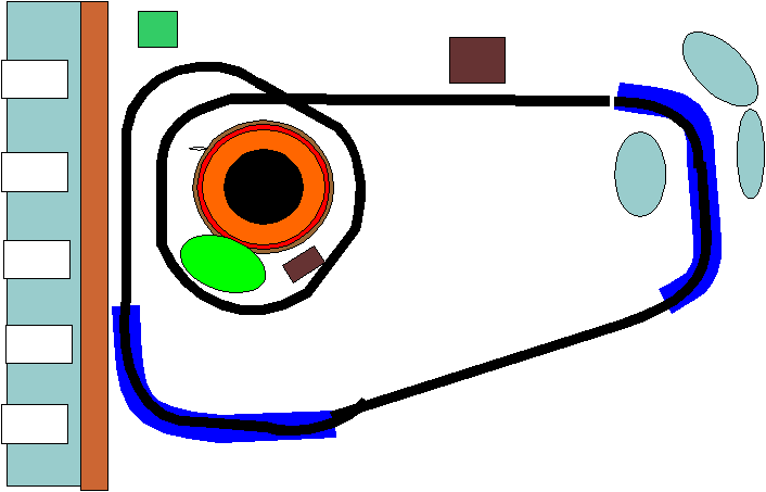 The bottom of this illustration depicts area facing house. The top is far edge. To the extreme left is the walkway alongside the garage. Those areas highlighted in blue are trestled / graded. Trestles are concealed in photos by grass. Rectangled in the layout are stations. Green area is where yucca plants protrude beside the brick well. Gray ellipses to the right are rocks. This illustration is NOT drawn to scale.