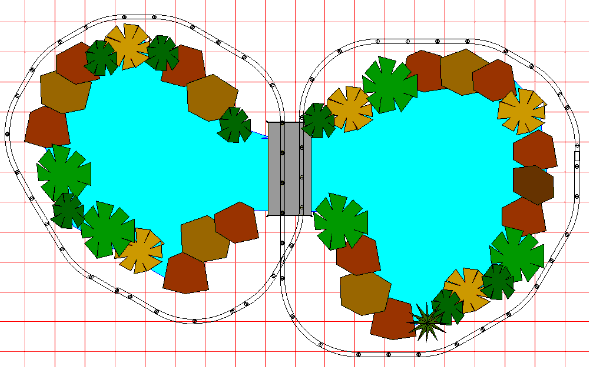 This pair of layouts is for a decorative garden railway that runs around a small pond or pool. They are especially good for dogbone- and kidney-shaped pools. You get a nice visual effect of a continuously-running train. They are easily expanded and altered to suit your particular garden. Naturally, classic small steam-type locomotives look best on these fine little railways.