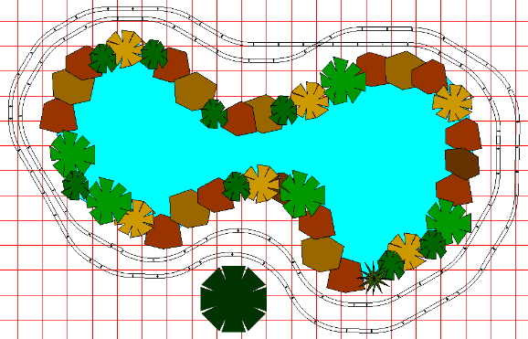 This 14' by 22' layout makes an interesting use of 5' curves and the 30 degree crossover. A train will make two passes around the pool. though we have shown the two loops of track placed closely together, you can space them further apart and plant between them or place rocks and scenery for a more varied journey. |