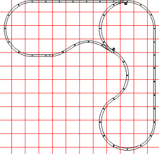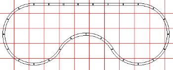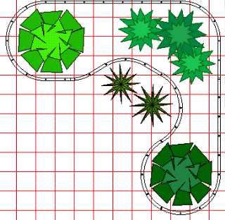 One again, moving up to 5' curves is easy. The Semi-Dogbone layouts would all be extended only 1' horizontally. The first two basic Dogbones would also be extended 1' vertically. The second pair of "revised' Dogbone layouts would be extended 1' 6 inches to 2' vertically. 2' would be better, since it affords more room for landscaping and plants. |