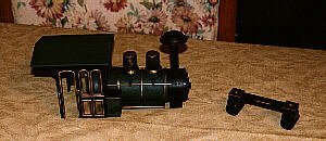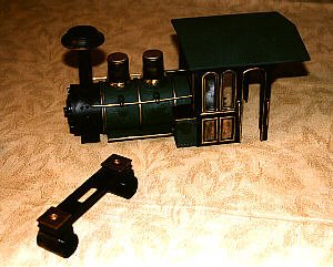 The loco, an 0-6-0 woodburner steamer, was missing all rods and pistons plus the electrical contacts. I dissassembled it. Boiler and cab were repainted. Rub N Buff was used to bring our brass highlights (actually, antqiue gold makes for a nice, polished brass look).