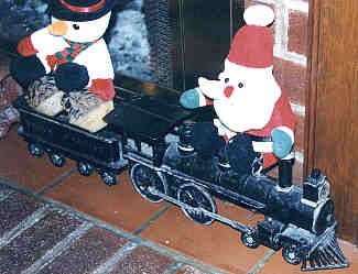 Add Santa, Snowman and pine cones, and this old train gets its Yule dressing. The locomotive is a 4-4-0 American type. |