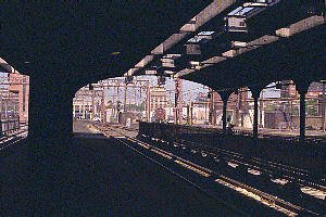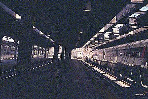 The classic Bush train sheds provide Hoboken's Lackawanna Terminal with great contrasts in light and shadow. Our previous shoots of Hoboken were on overcast days - ideal for photographers. This latest group of pictures were taken on a bright morning. The rush hour had just ended, leaving the terminal a blend of bright sunlight and cool shade.