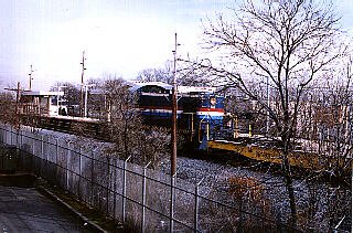SIRT's MOW has three types of locomotive - a small 70 tonner in yellow (they have two), an EMD switcher in dark blue, and what looks to be a Baldwin in faded blue. The exact type is difficult to discern, since these locomotives have been rebuilt and reconfigured so many times!