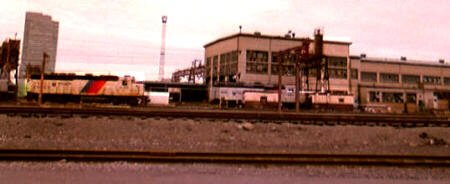 The plaza outside the old ferry entrance is now a small park That big brown building is the new switch tower for the yard A GP 40 locomotive waits beside passenger cars at the platform |