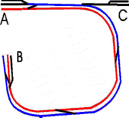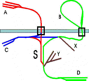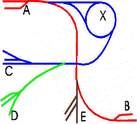 The Switchman's Cross, as a switching operation, has two main lines. The Red line is a simple point-to-point short line running from A to B, with service to an industrial yard at E. The Blue Line is more detailed, having point-to-point from A to C, a spur at D, and a reversing loop at X. Both lines originate at A. The Blue crosses the Red Line midway between A and B. You may use either a 90% crossover or an overpass. Any transfer of trains between Red and Blue must occur at A. Looks simple? Hmmmm.